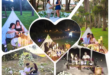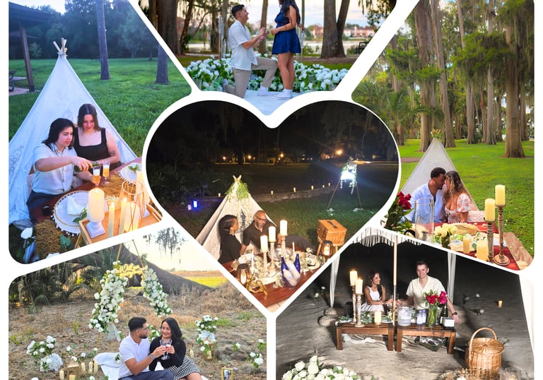 Romantic picnic proposals with teepee tents, arches, lights, and custom add-ons—perfect for parks, beaches, or backyards. Designed to make your moment magical.